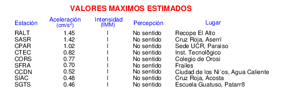 Intensidades en sitios de registro.Cada uno de los cuadrados en el mapa corresponde a la ubicación de un acelerógrafo al momento del sismo. Estos se muestran en distintos colores según la escala mostrada al pie de la figura.