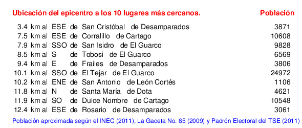 Mapa de la zona epicentral. Se muestran las poblaciones más cercanas al epicentro y fallas activas. Abajo están las distancias que hay del epicentro a cada uno de los diez sitios más cercanos y la cantidad de habitantes que poseen.