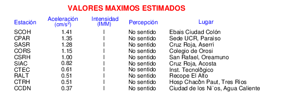 Intensidades en sitios de registro.Cada uno de los cuadrados en el mapa corresponde a la ubicación de un acelerógrafo al momento del sismo. Estos se muestran en distintos colores según la escala mostrada al pie de la figura.