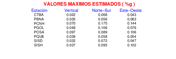 La siguiente tabla muestra los datos de aceleración máxima para cada componente en porcentaje de la aceleración de la gravedad (%g). Estos se obtienen dividiendo el valor del PGA registrado por 980 cm/s2 y multiplicándolo por 100.