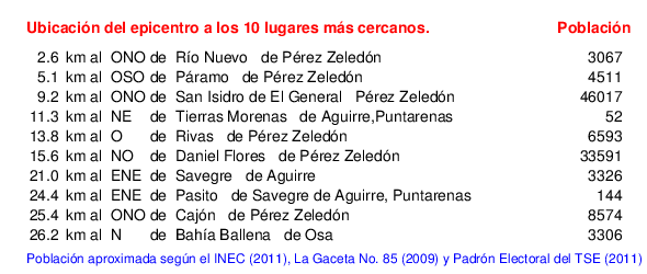 Mapa de la zona epicentral. Se muestran las poblaciones más cercanas al epicentro y fallas activas. Abajo están las distancias que hay del epicentro a cada uno de los diez sitios más cercanos y la cantidad de habitantes que poseen.