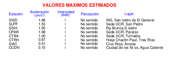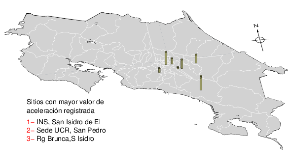 Intensidades en sitios de registro.Cada uno de los cuadrados en el mapa corresponde a la ubicación de un acelerógrafo al momento del sismo. Estos se muestran en distintos colores según la escala mostrada al pie de la figura.