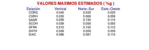 La siguiente tabla muestra los datos de aceleración máxima para cada componente en porcentaje de la aceleración de la gravedad (%g). Estos se obtienen dividiendo el valor del PGA registrado por 980 cm/s2 y multiplicándolo por 100.