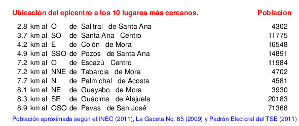Mapa de la zona epicentral. Se muestran las poblaciones más cercanas al epicentro y fallas activas. Abajo están las distancias que hay del epicentro a cada uno de los diez sitios más cercanos y la cantidad de habitantes que poseen.