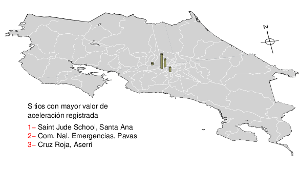 Intensidades en sitios de registro.Cada uno de los cuadrados en el mapa corresponde a la ubicación de un acelerógrafo al momento del sismo. Estos se muestran en distintos colores según la escala mostrada al pie de la figura.
