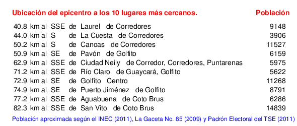Mapa de la zona epicentral. Se muestran las poblaciones más cercanas al epicentro y fallas activas. Abajo están las distancias que hay del epicentro a cada uno de los diez sitios más cercanos y la cantidad de habitantes que poseen.