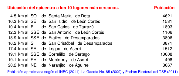 Mapa de la zona epicentral. Se muestran las poblaciones más cercanas al epicentro y fallas activas. Abajo están las distancias que hay del epicentro a cada uno de los diez sitios más cercanos y la cantidad de habitantes que poseen.