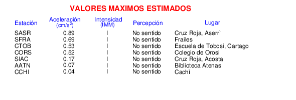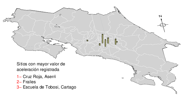 Intensidades en sitios de registro.Cada uno de los cuadrados en el mapa corresponde a la ubicación de un acelerógrafo al momento del sismo. Estos se muestran en distintos colores según la escala mostrada al pie de la figura.