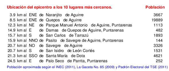Mapa de la zona epicentral. Se muestran las poblaciones más cercanas al epicentro y fallas activas. Abajo están las distancias que hay del epicentro a cada uno de los diez sitios más cercanos y la cantidad de habitantes que poseen.