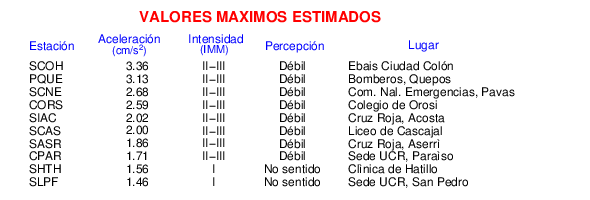 Intensidades en sitios de registro.Cada uno de los cuadrados en el mapa corresponde a la ubicación de un acelerógrafo al momento del sismo. Estos se muestran en distintos colores según la escala mostrada al pie de la figura.