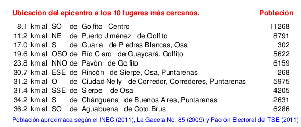 Mapa de la zona epicentral. Se muestran las poblaciones más cercanas al epicentro y fallas activas. Abajo están las distancias que hay del epicentro a cada uno de los diez sitios más cercanos y la cantidad de habitantes que poseen.