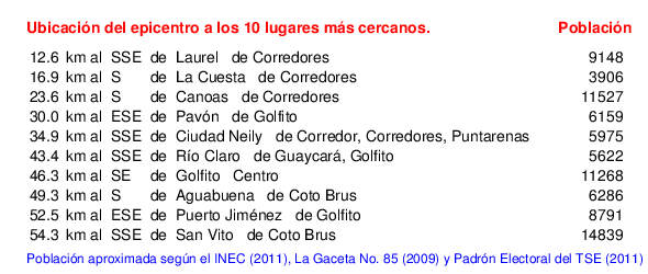 Mapa de la zona epicentral. Se muestran las poblaciones más cercanas al epicentro y fallas activas. Abajo están las distancias que hay del epicentro a cada uno de los diez sitios más cercanos y la cantidad de habitantes que poseen.