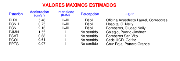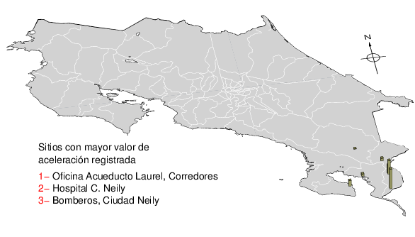 Intensidades en sitios de registro.Cada uno de los cuadrados en el mapa corresponde a la ubicación de un acelerógrafo al momento del sismo. Estos se muestran en distintos colores según la escala mostrada al pie de la figura.