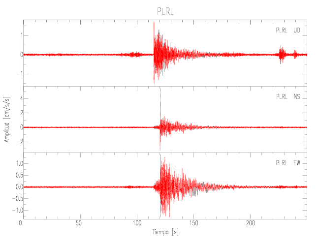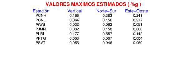 La siguiente tabla muestra los datos de aceleración máxima para cada componente en porcentaje de la aceleración de la gravedad (%g). Estos se obtienen dividiendo el valor del PGA registrado por 980 cm/s2 y multiplicándolo por 100.