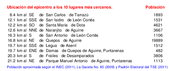Mapa de la zona epicentral. Se muestran las poblaciones más cercanas al epicentro y fallas activas. Abajo están las distancias que hay del epicentro a cada uno de los diez sitios más cercanos y la cantidad de habitantes que poseen.