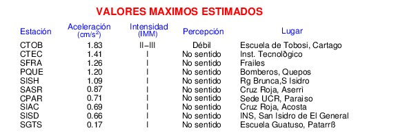 Intensidades en sitios de registro.Cada uno de los cuadrados en el mapa corresponde a la ubicación de un acelerógrafo al momento del sismo. Estos se muestran en distintos colores según la escala mostrada al pie de la figura.