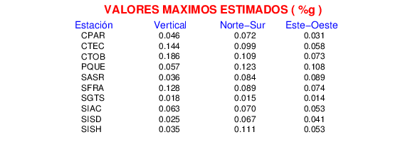 La siguiente tabla muestra los datos de aceleración máxima para cada componente en porcentaje de la aceleración de la gravedad (%g). Estos se obtienen dividiendo el valor del PGA registrado por 980 cm/s2 y multiplicándolo por 100.