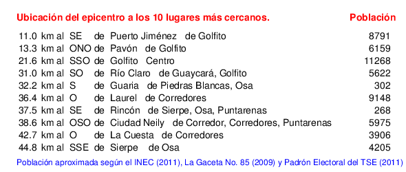 Mapa de la zona epicentral. Se muestran las poblaciones más cercanas al epicentro y fallas activas. Abajo están las distancias que hay del epicentro a cada uno de los diez sitios más cercanos y la cantidad de habitantes que poseen.