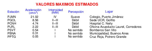 Intensidades en sitios de registro.Cada uno de los cuadrados en el mapa corresponde a la ubicación de un acelerógrafo al momento del sismo. Estos se muestran en distintos colores según la escala mostrada al pie de la figura.