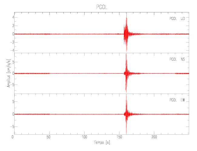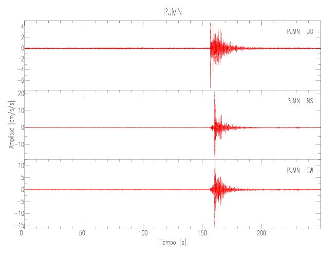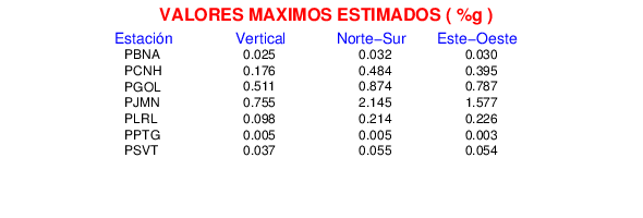 La siguiente tabla muestra los datos de aceleración máxima para cada componente en porcentaje de la aceleración de la gravedad (%g). Estos se obtienen dividiendo el valor del PGA registrado por 980 cm/s2 y multiplicándolo por 100.