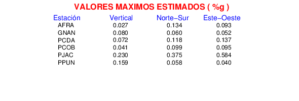 La siguiente tabla muestra los datos de aceleración máxima para cada componente en porcentaje de la aceleración de la gravedad (%g). Estos se obtienen dividiendo el valor del PGA registrado por 980 cm/s2 y multiplicándolo por 100.