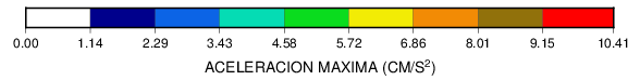 Mapa de valores de aceleración máximos. El mayor valor de aceleración aparecerá en color rojo de acuerdo a la escala proporcionada al pie de la figura.