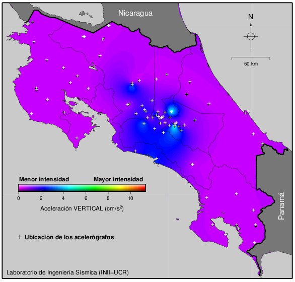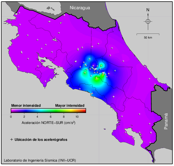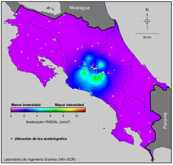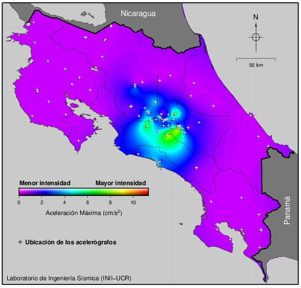 Estos son los valores de PGA de algunos sismos de importancia que han sucedido en Costa Rica desde 1990 hasta el presente. El sismo último es mostrado como una estrella roja. El más grande registrado ha sido el del 05 de setiembre del 2012 en Nicoya con una magnitud Mw 7.6. El del 22 de abril de 1991 en el Valle de la Estrella también fue igualmente grande, sin embargo, en ese entonces la cobertura de la red se limitaba al Valle Central, por lo que no se obtuvieron registros cerca del epicentro.