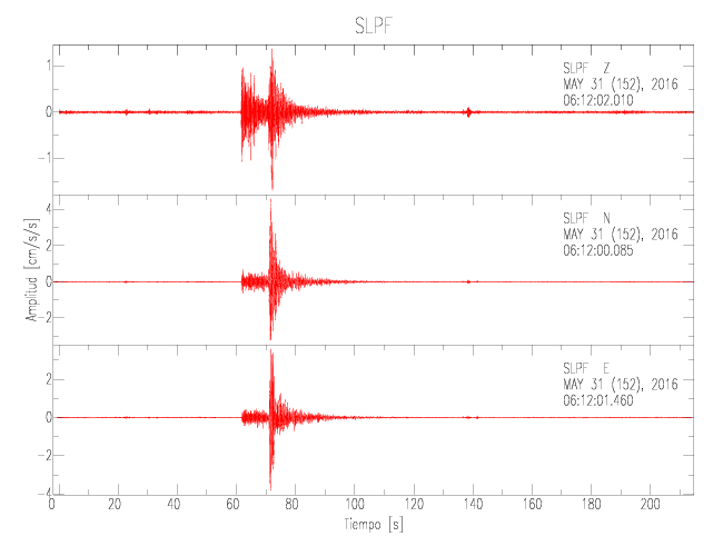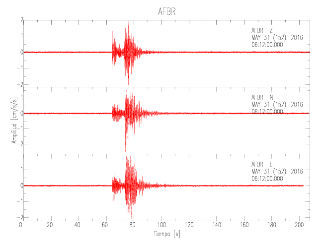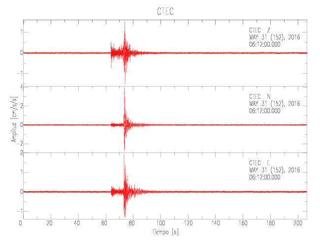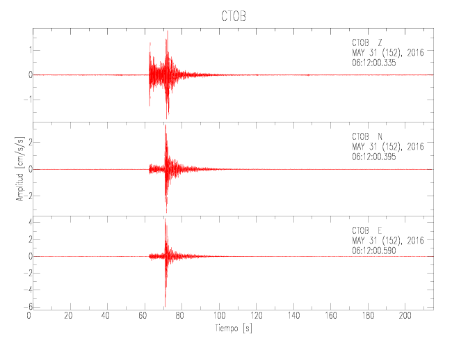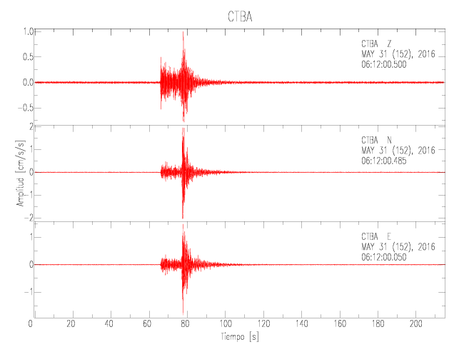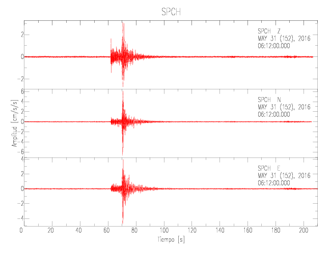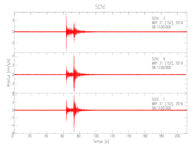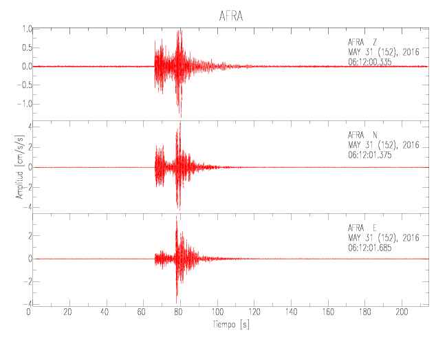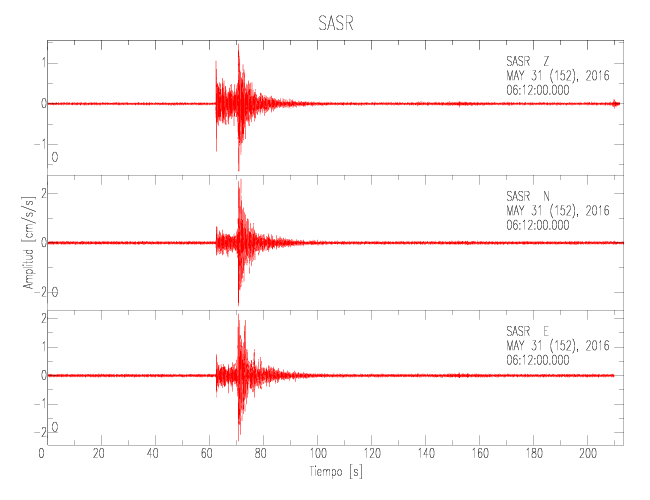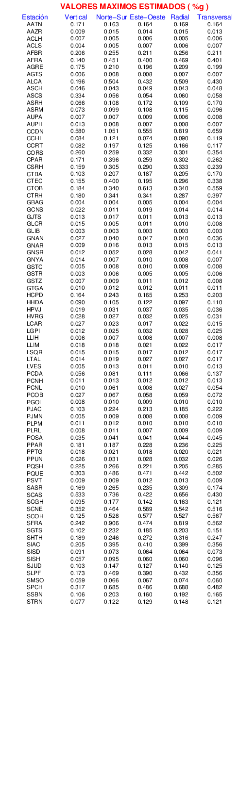 La siguiente tabla muestra los datos de aceleración máxima para cada componente en porcentaje de la aceleración de la gravedad (%g). Estos se obtienen dividiendo el valor del PGA registrado por 980 cm/s2 y multiplicándolo por 100. Las estaciones se listan en orden alfabético. Los valores de las últimas dos columnas corresponden a la componente radial y transversal.