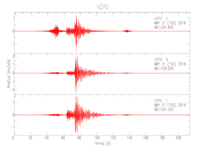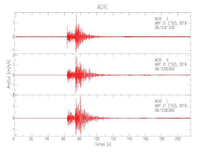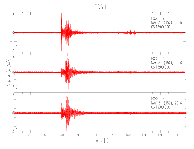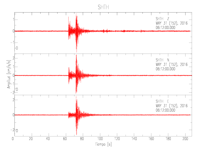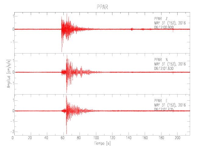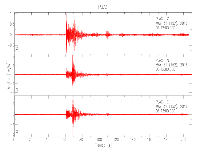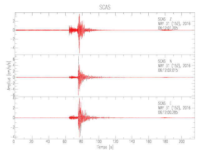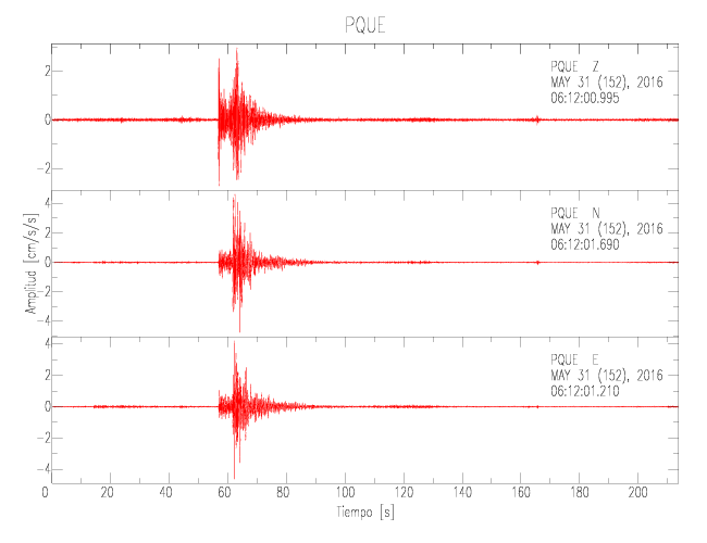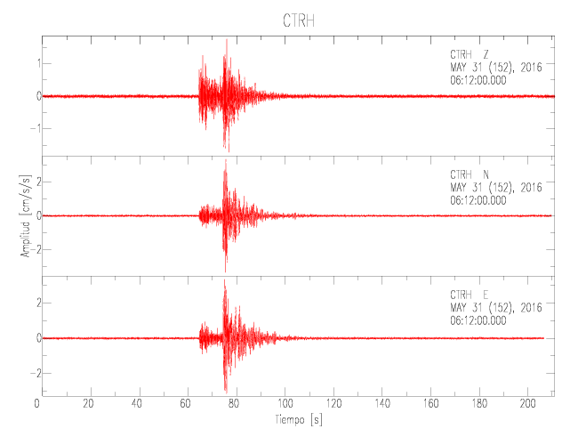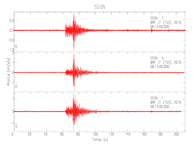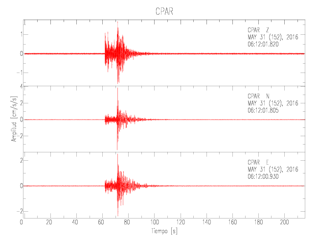 La siguiente tabla muestra los datos de aceleración máxima para cada componente en porcentaje de la aceleración de la gravedad (%g). Estos se obtienen dividiendo el valor del PGA registrado por 980 cm/s2 y multiplicándolo por 100. Las estaciones se listan en orden alfabético. Los valores de las últimas dos columnas corresponden a la componente radial y transversal.