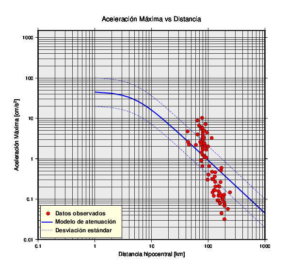 Datos del valor de la aceleración máxima (PGA por sus siglas en inglés) de cada estación (puntos rojos) en función de la distancia al hipocentro. Las trazas azules corresponden al modelo de atenuación y su respectiva desviación estándar.