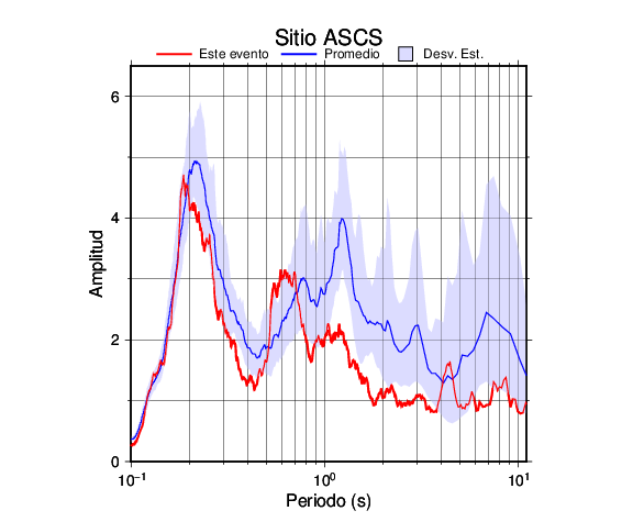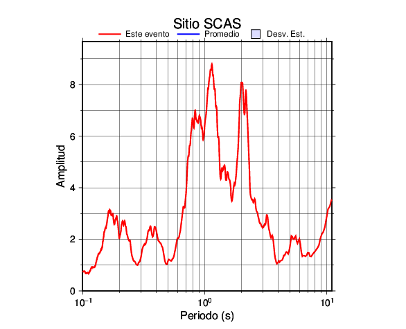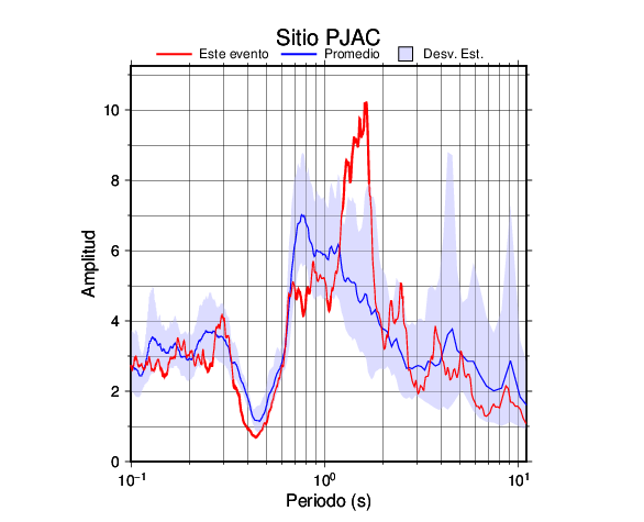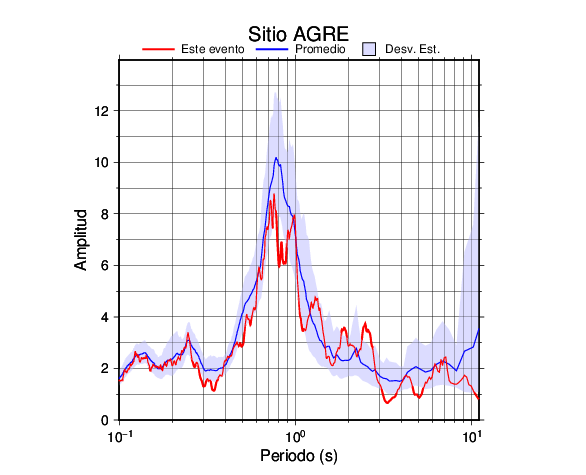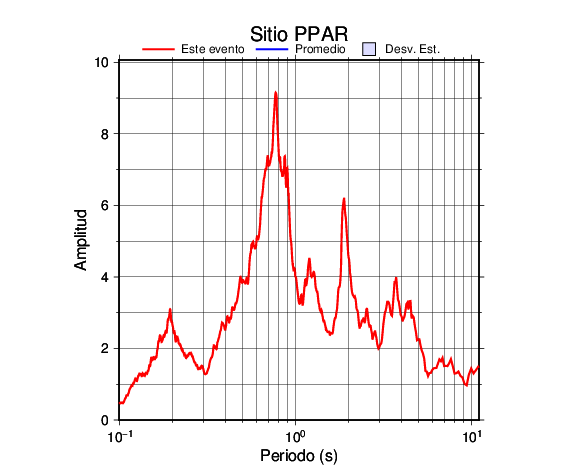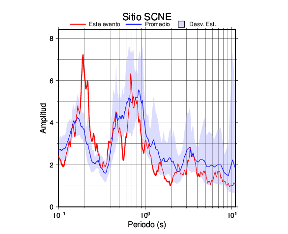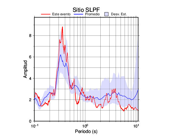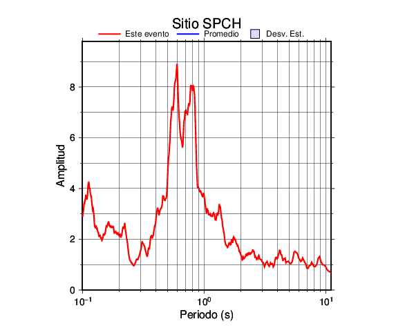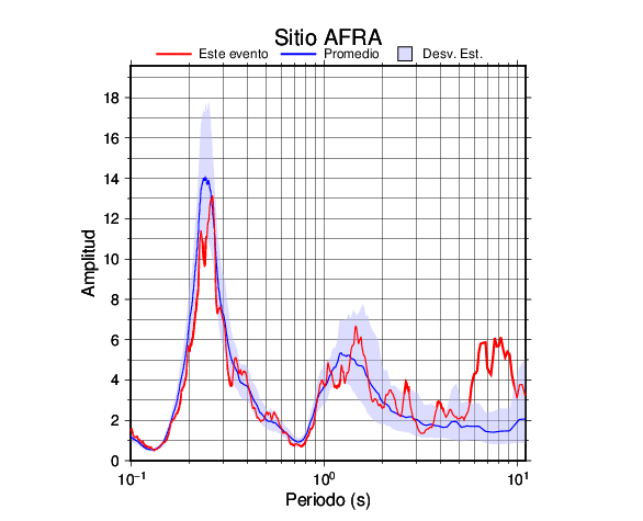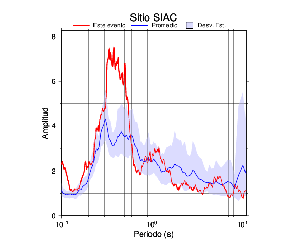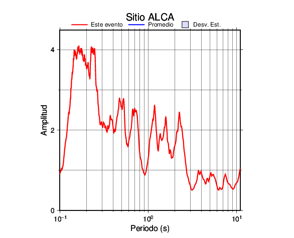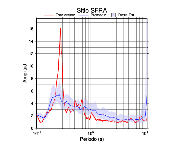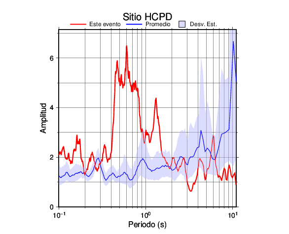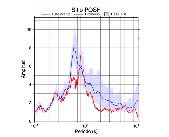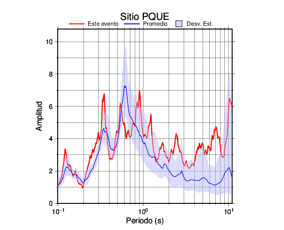 Los resultados que se presentan aquí fueron obtenidos luego de dividir las componentes horizontales entre la componente vertical (conocido como técnica H/V). Se grafica tanto el efecto de sitio del sismo registrado como el valor promedio en cada estación y su correspondiente desviación estándar.