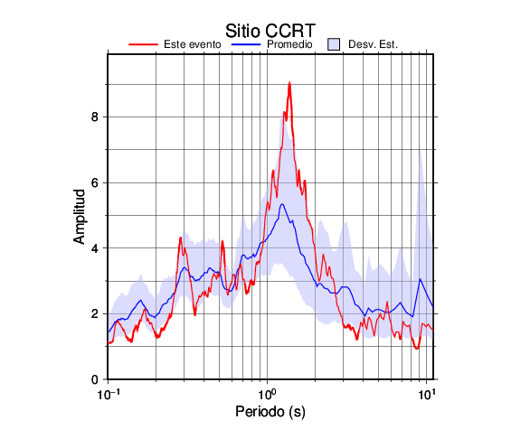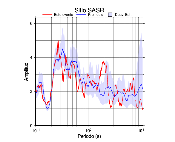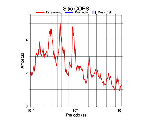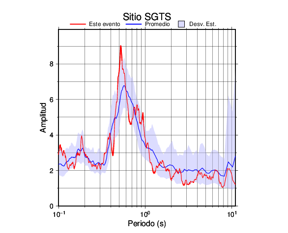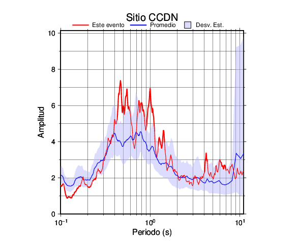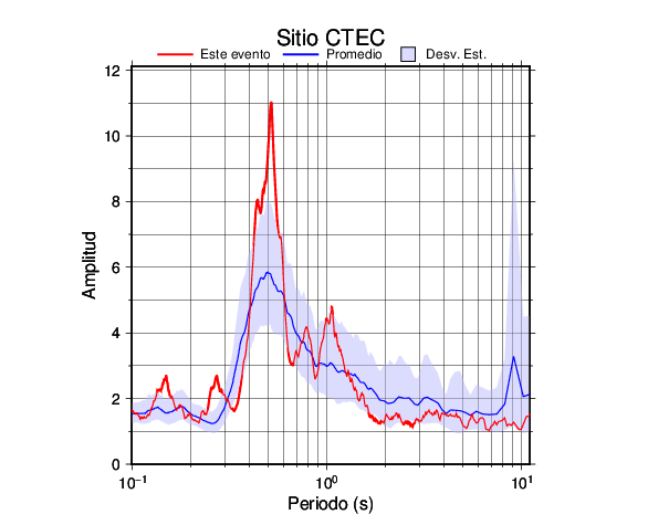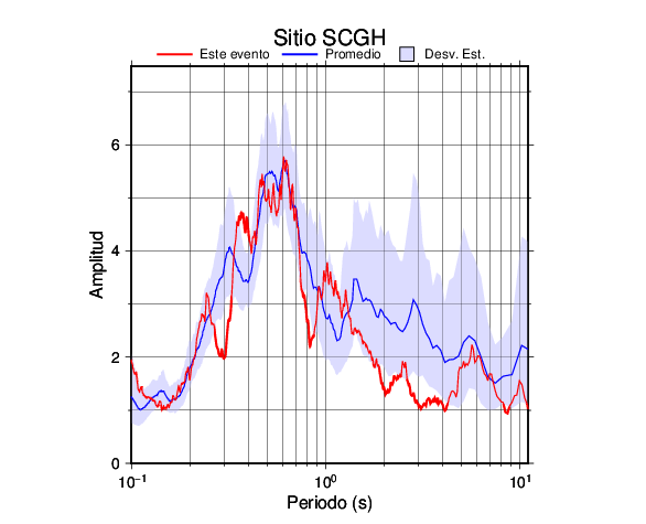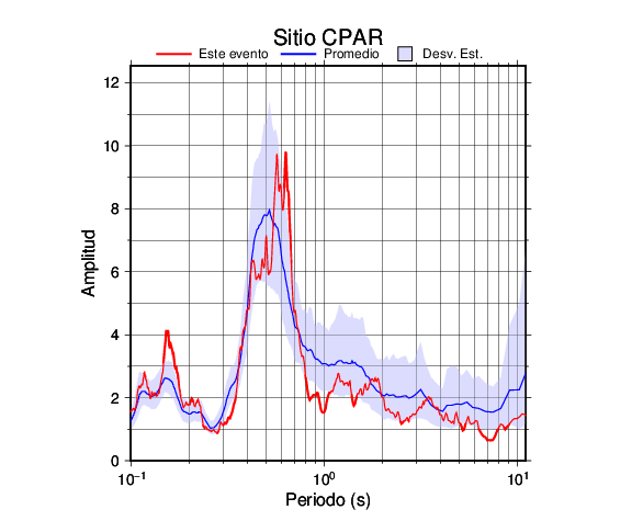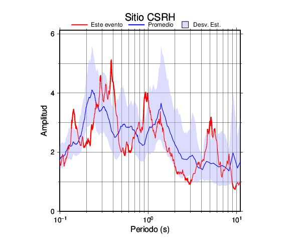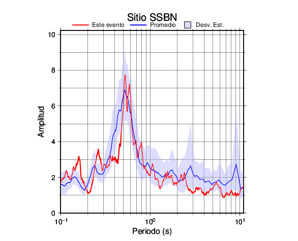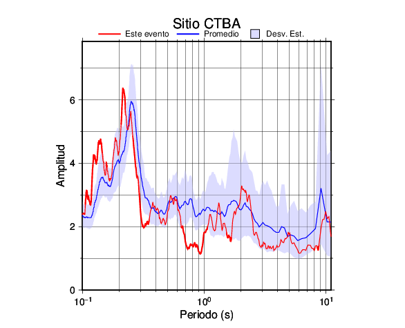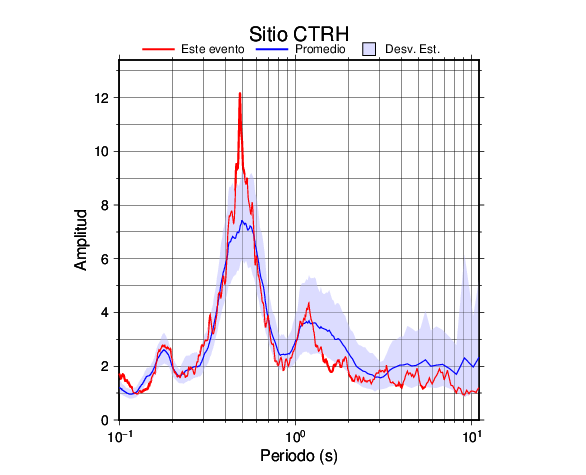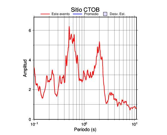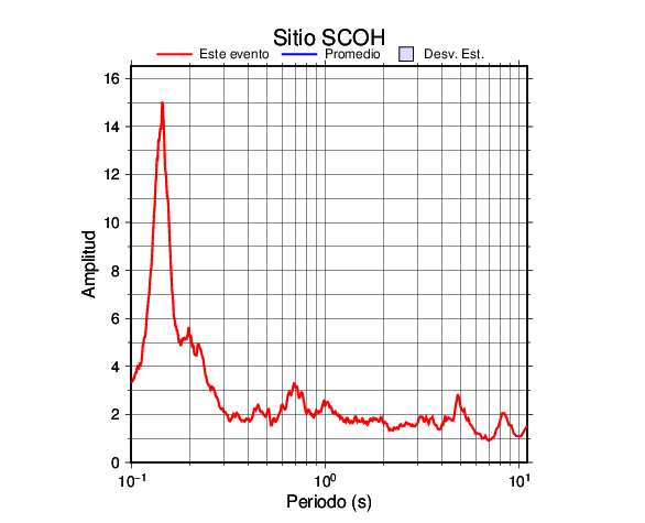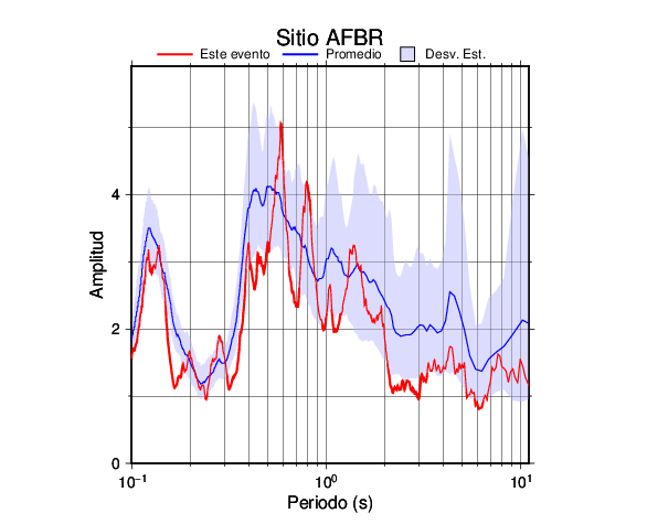 Los resultados que se presentan aquí fueron obtenidos luego de dividir las componentes horizontales entre la componente vertical (conocido como técnica H/V). Se grafica tanto el efecto de sitio del sismo registrado como el valor promedio en cada estación y su correspondiente desviación estándar.