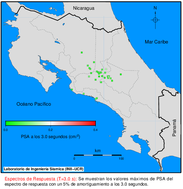 Estos mapas muestran los valores de la PSA en las distintas estacioes para los periodos de 0.3, 1.0 y 3.0 segundos