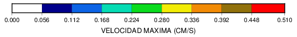 Mapa de valores de velocidad máxima. La estación que reportó el mayor valor de velocidad aparecerá en color rojo de acuerdo a la escala proporcionada al pie de la figura.