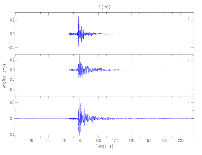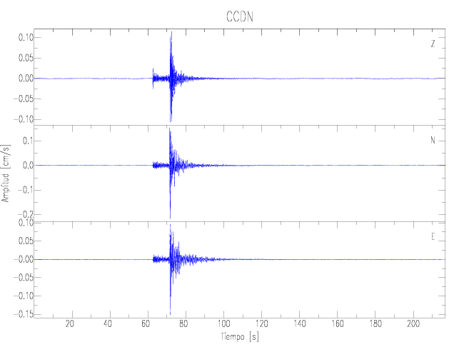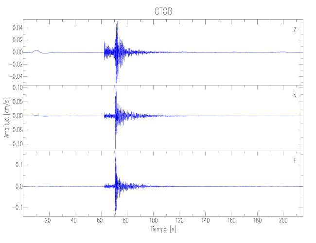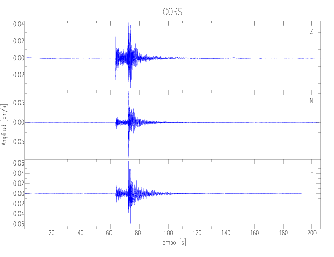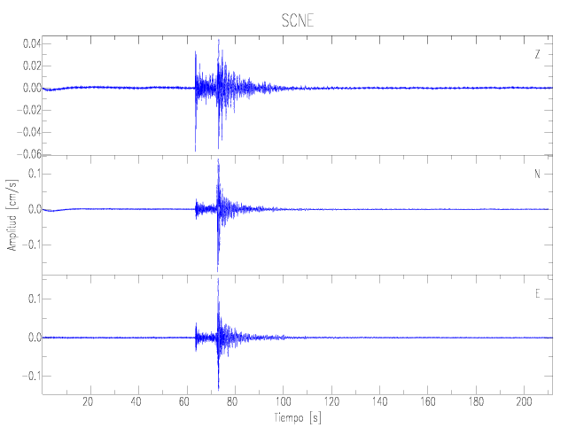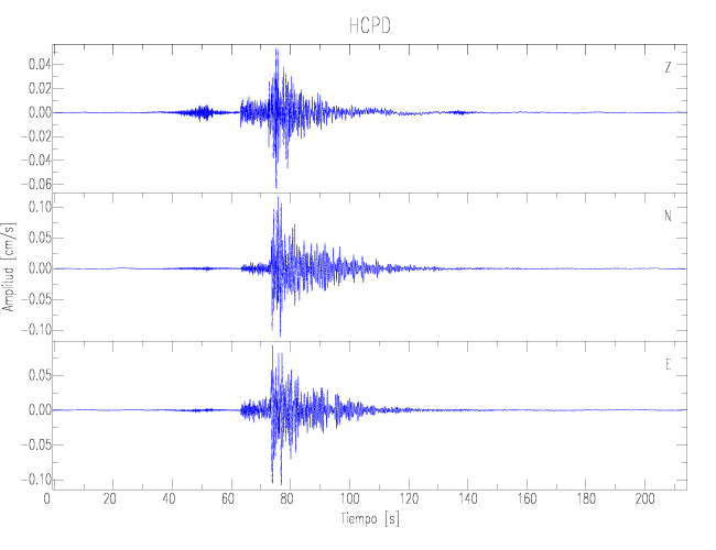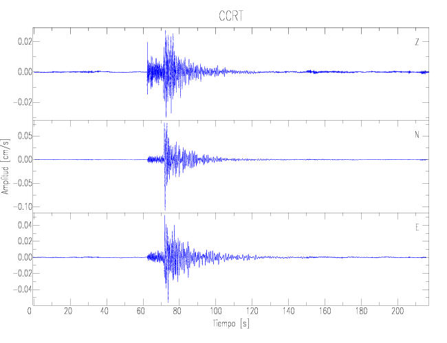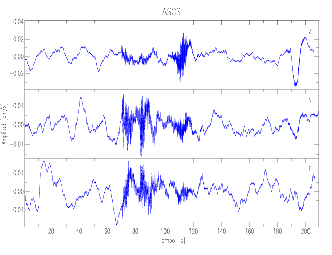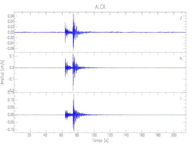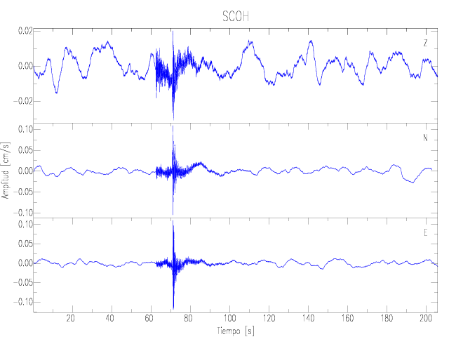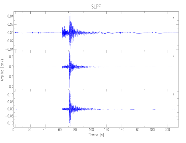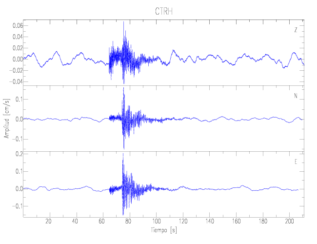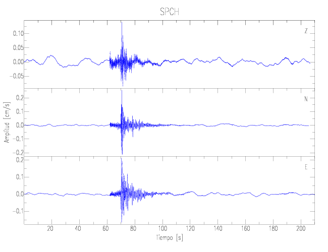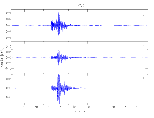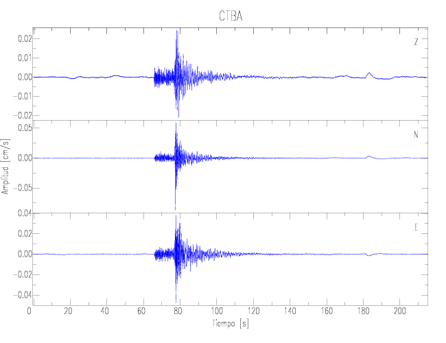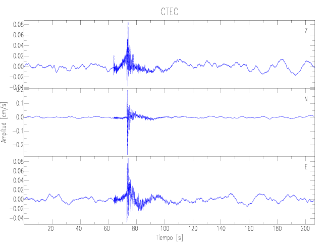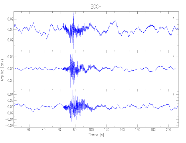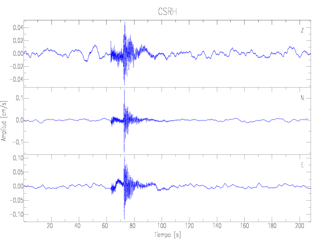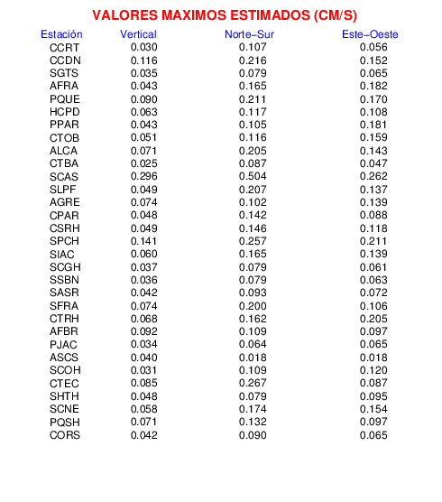 Los registros de velocidad se obtienen de la integración de los datos de aceleración. Esta tabla contiene los valores de velocidad máxima (PGV por sus siglas en inglés) para cada componente en cm/s. Las estaciones se listan en orden alfabético y corresponden a los sitios en que el nivel de aceleración fue superior a los 2 cm/s2.