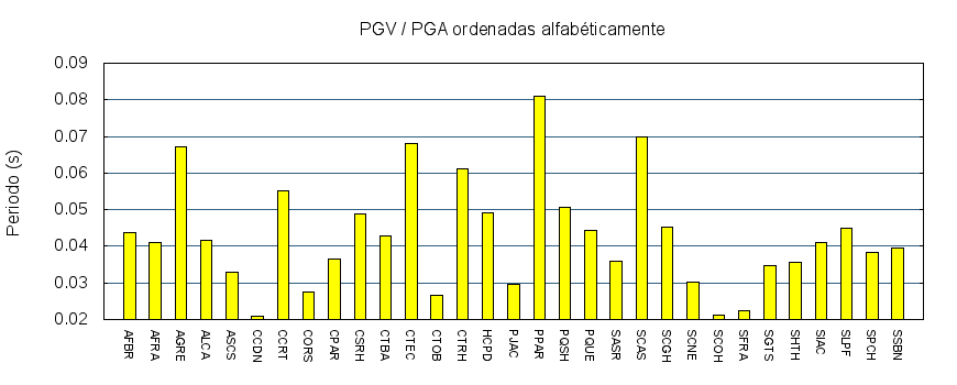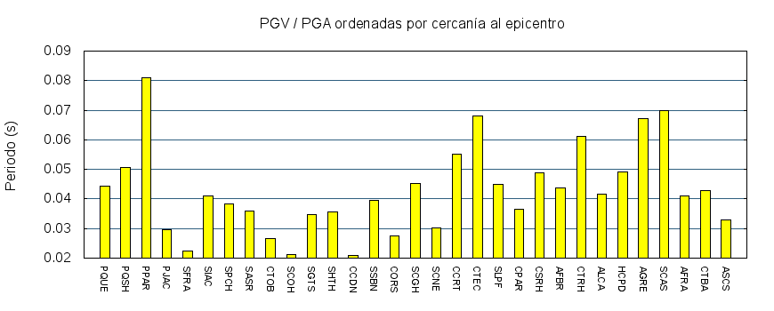 El cociente de la velocidad máxima (PGV) entre la aceleración máxima (PGA) brinda información de los periodos más significativos del movimiento del suelo. En el gráfico siguiente se muestran las estaciones ordenadas por su cercanía al epicentro. La más cercana está a la izquierda y la más lejana a la derecha. También se muestran los mismos datos en orden alfabético y ordenados de mayor a menor amplitud.