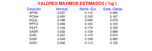 La siguiente tabla muestra los datos de aceleración máxima para cada componente en porcentaje de la aceleración de la gravedad (%g). Estos se obtienen dividiendo el valor del PGA registrado por 980 cm/s2 y multiplicándolo por 100.