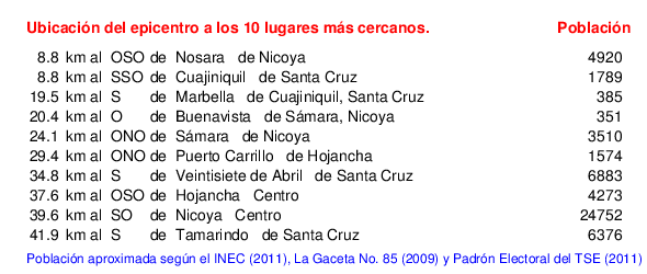 Mapa de la zona epicentral. Se muestran las poblaciones más cercanas al epicentro y fallas activas. Abajo están las distancias que hay del epicentro a cada uno de los diez sitios más cercanos y la cantidad de habitantes que poseen.
