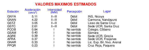 Intensidades en sitios de registro.Cada uno de los cuadrados en el mapa corresponde a la ubicación de un acelerógrafo al momento del sismo. Estos se muestran en distintos colores según la escala mostrada al pie de la figura.