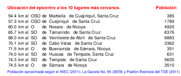 Mapa de la zona epicentral. Se muestran las poblaciones más cercanas al epicentro y fallas activas. Abajo están las distancias que hay del epicentro a cada uno de los diez sitios más cercanos y la cantidad de habitantes que poseen.