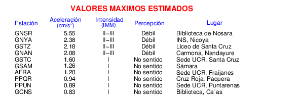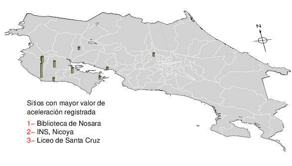 Intensidades en sitios de registro.Cada uno de los cuadrados en el mapa corresponde a la ubicación de un acelerógrafo al momento del sismo. Estos se muestran en distintos colores según la escala mostrada al pie de la figura.