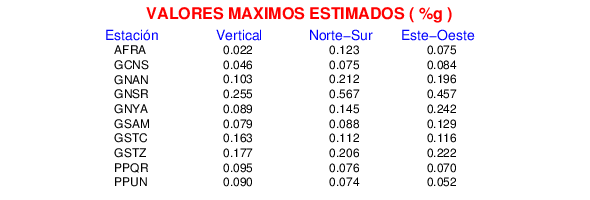 La siguiente tabla muestra los datos de aceleración máxima para cada componente en porcentaje de la aceleración de la gravedad (%g). Estos se obtienen dividiendo el valor del PGA registrado por 980 cm/s2 y multiplicándolo por 100.