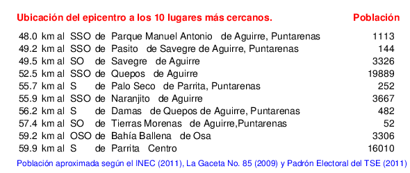 Mapa de la zona epicentral. Se muestran las poblaciones más cercanas al epicentro y fallas activas. Abajo están las distancias que hay del epicentro a cada uno de los diez sitios más cercanos y la cantidad de habitantes que poseen.