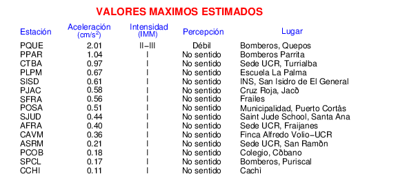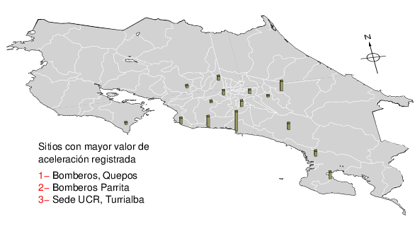 Intensidades en sitios de registro.Cada uno de los cuadrados en el mapa corresponde a la ubicación de un acelerógrafo al momento del sismo. Estos se muestran en distintos colores según la escala mostrada al pie de la figura.