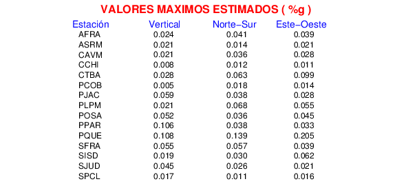 La siguiente tabla muestra los datos de aceleración máxima para cada componente en porcentaje de la aceleración de la gravedad (%g). Estos se obtienen dividiendo el valor del PGA registrado por 980 cm/s2 y multiplicándolo por 100.