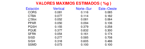 La siguiente tabla muestra los datos de aceleración máxima para cada componente en porcentaje de la aceleración de la gravedad (%g). Estos se obtienen dividiendo el valor del PGA registrado por 980 cm/s2 y multiplicándolo por 100.