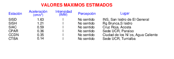 Intensidades en sitios de registro.Cada uno de los cuadrados en el mapa corresponde a la ubicación de un acelerógrafo al momento del sismo. Estos se muestran en distintos colores según la escala mostrada al pie de la figura.