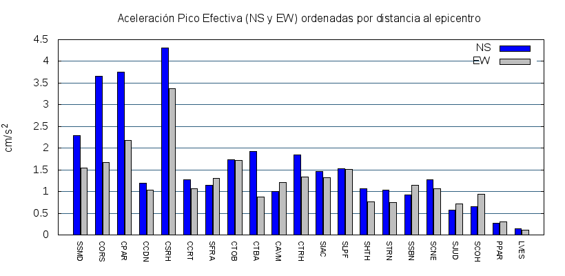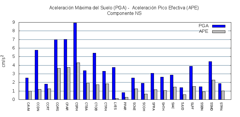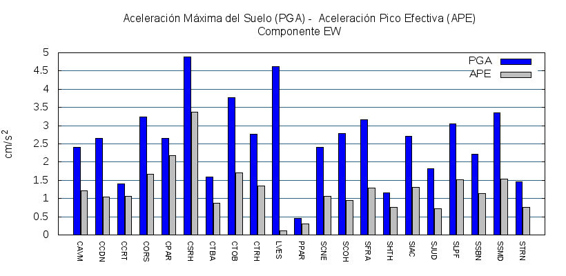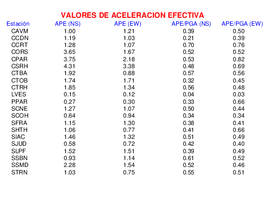 La siguiente tabla muestra los valores de aceleración efectiva para las componentes norte-sur (NS) y este-oeste (EW). También se muestra el valor del cociente entre la aceleración efectiva y la aceleración máxima (APE/PGA).