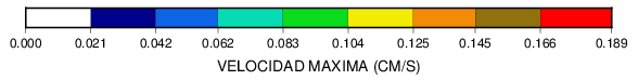 Mapa de valores de velocidad máxima. La estación que reportó el mayor valor de velocidad aparecerá en color rojo de acuerdo a la escala proporcionada al pie de la figura.