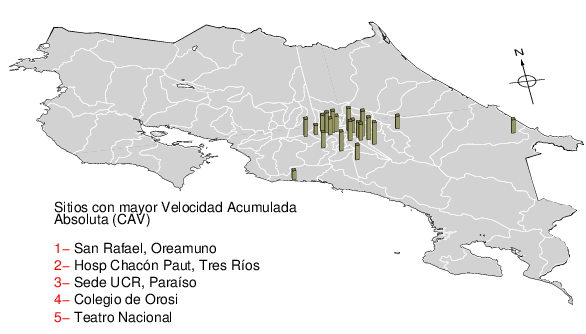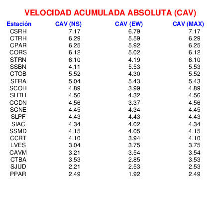 La velocidad acumulada absoluta (CAV por sus siglas en inglés) es otro parámetro que se usa para caracterizar el movimiento fuerte del suelo. Los datos están dados en cm/s para las componentes norte-sur (NS) y este-oeste (EW). El máximo de ambas se da en la tercera columna.
